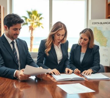 Expat couple with lawyer reviewing a tax deadline checklist in a bright Costa Blanca office